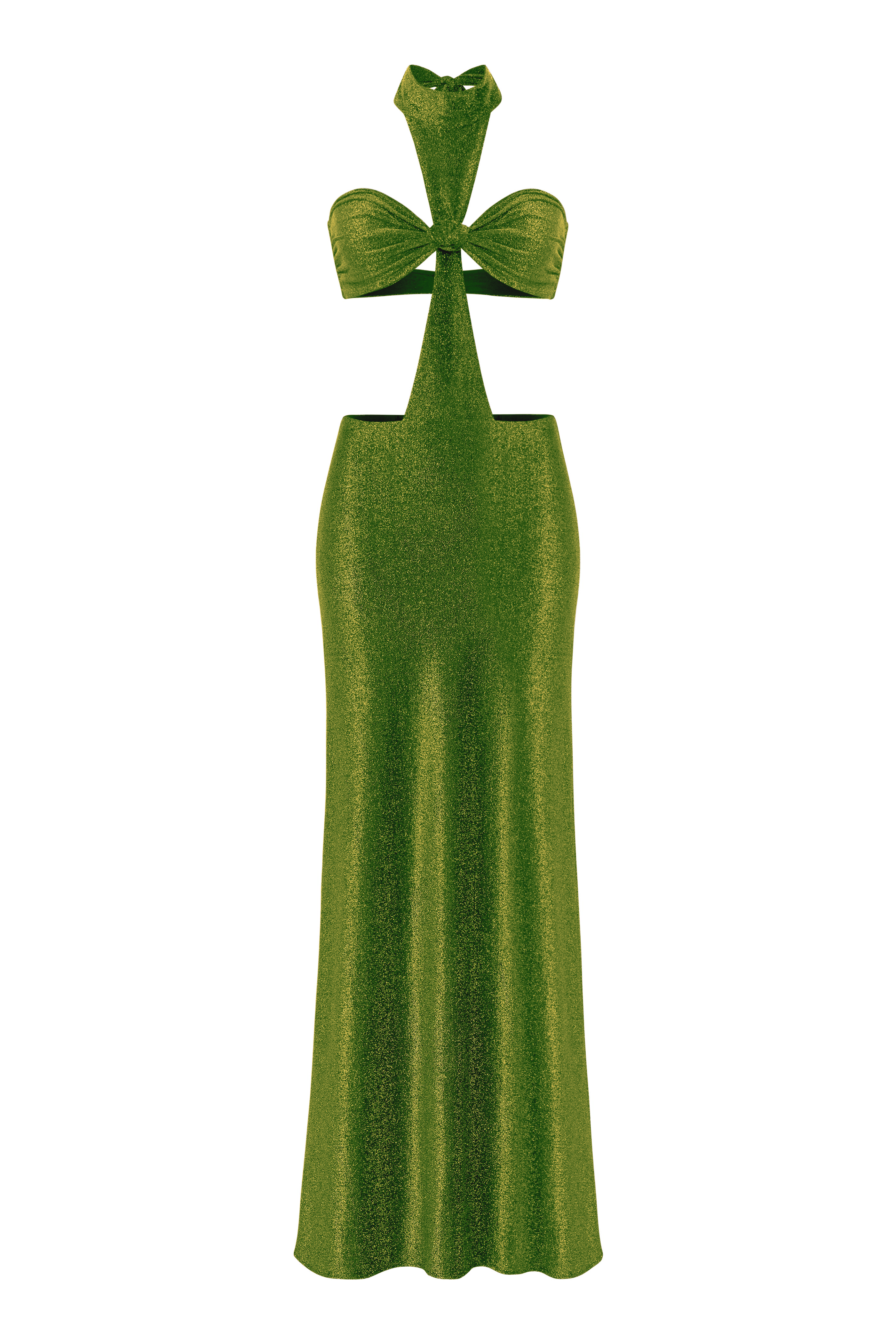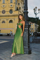 Introducing the Aria Dress: your ultimate night-out, vacation-ready piece. This dress is the perfect blend of elegance and versatility. This dress offers a tie neck for maximum support and a gold clasp to hold the dress up along the back. Designed for your evening soirée, the Aria Dress adds a touch of glamour to your resort wardrobe with its flattering cut-out silhouette and sparkly texture. It is crafted from high-end Italian lurex fabric, and lined with lycra for added comfort. This dress is the essential addition you didn’t know you needed.