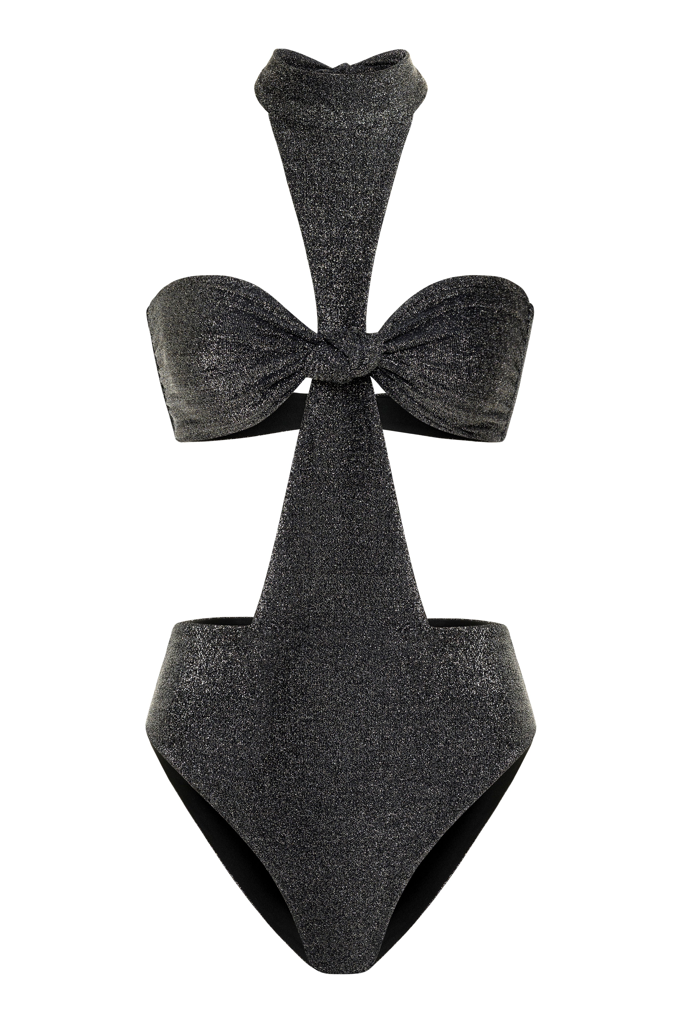 Introducing the Camille Swimsuit, perfectly suited for your day-to-night adventure. This luxurious cut out, high-waisted one piece has a gold clasp hook in the back for support, as well as a tie neck to hold the suit up. It is crafted from high-end Italian lurex fabric, and lined with lycra for added comfort, making it the perfect addition to your vacation wardrobe. This one-piece transitions seamlessly from poolside lounging to an elegant dinner paired with your favorite skirt or pants!