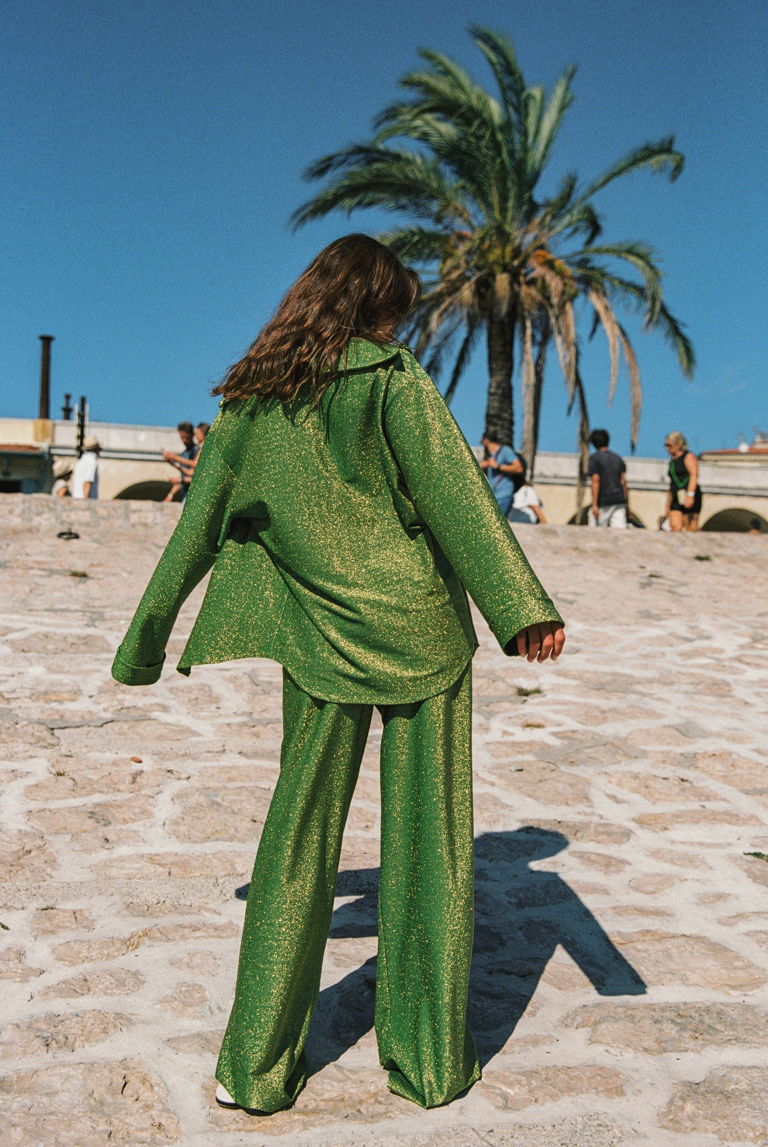 Introducing the Victoria Pants, crafted from high-end Italian lurex fabric, and lined with lycra for added comfort. These stunning pants offer an elastic waist band along with a draw string tie in order to ensure the perfect fit for any occasion. Elevate your wardrobe with the Victoria Pants, effortlessly transitioning them from day to night. This piece pairs perfectly with the Victoria Top or over any of our green swimsuits.