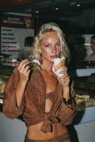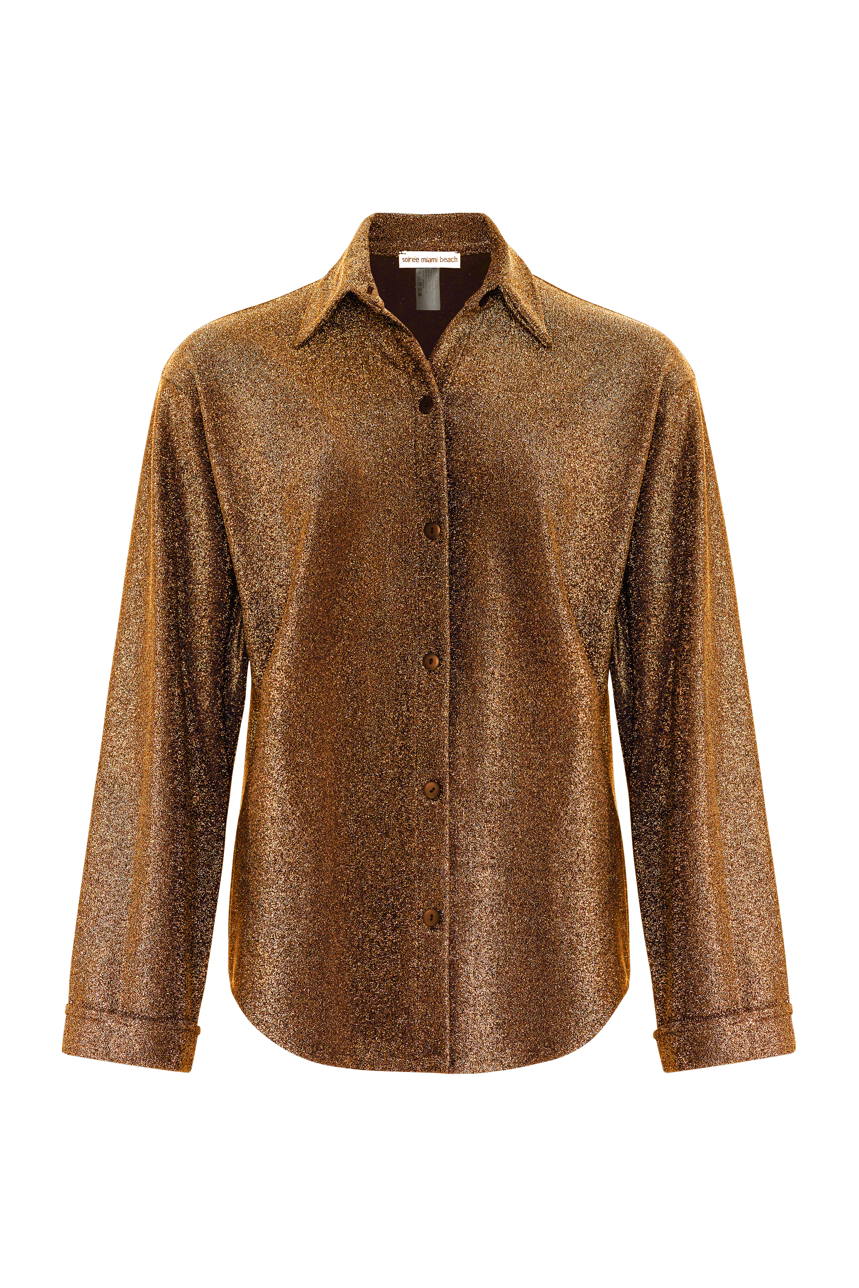 Introducing the Victoria Shirt: the perfect sparkly button-down shirt that effortlessly elevates any ensemble. This piece pairs perfectly with the Victoria Pants or over any of our brown swimsuits. It is crafted from a sparkly lurex material and lined with comfort, making it the perfect addition to your vacation wardrobe. Embrace timeless elegance and versatility with this must-have piece!