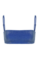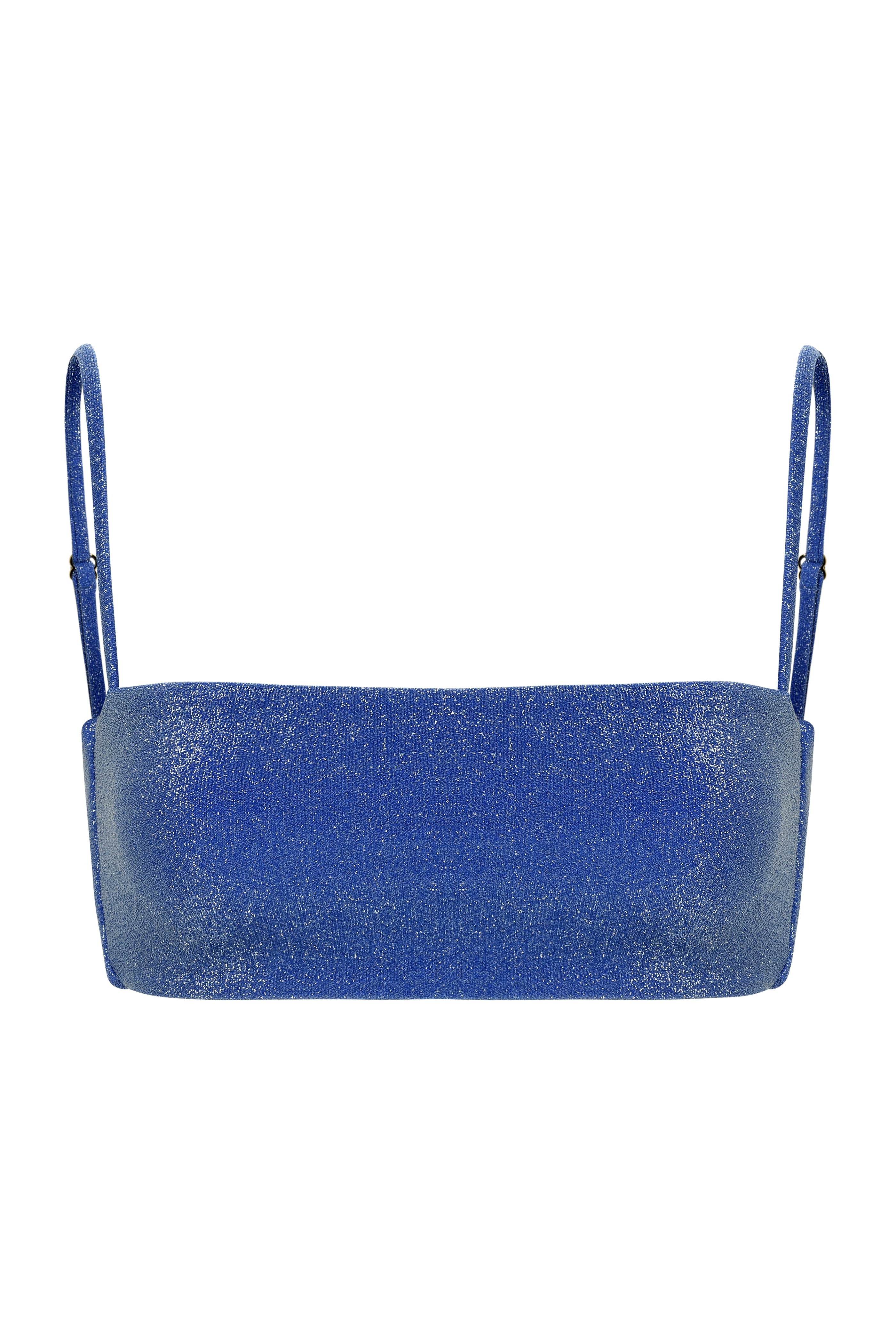 Introducing the Ella Bikini Top: The perfect sparkly bikini top for any beach day. It is crafted from high-end Italian lurex fabric, and lined with lycra for added comfort. This bandeau top is a full coverage top with adjustable straps for the perfect fit, as well as a gold clasp hook in the back. This bikini top can also be worn with the Becca Bikini Bottom. This is the ultimate bikini top you didn't know you needed until now!