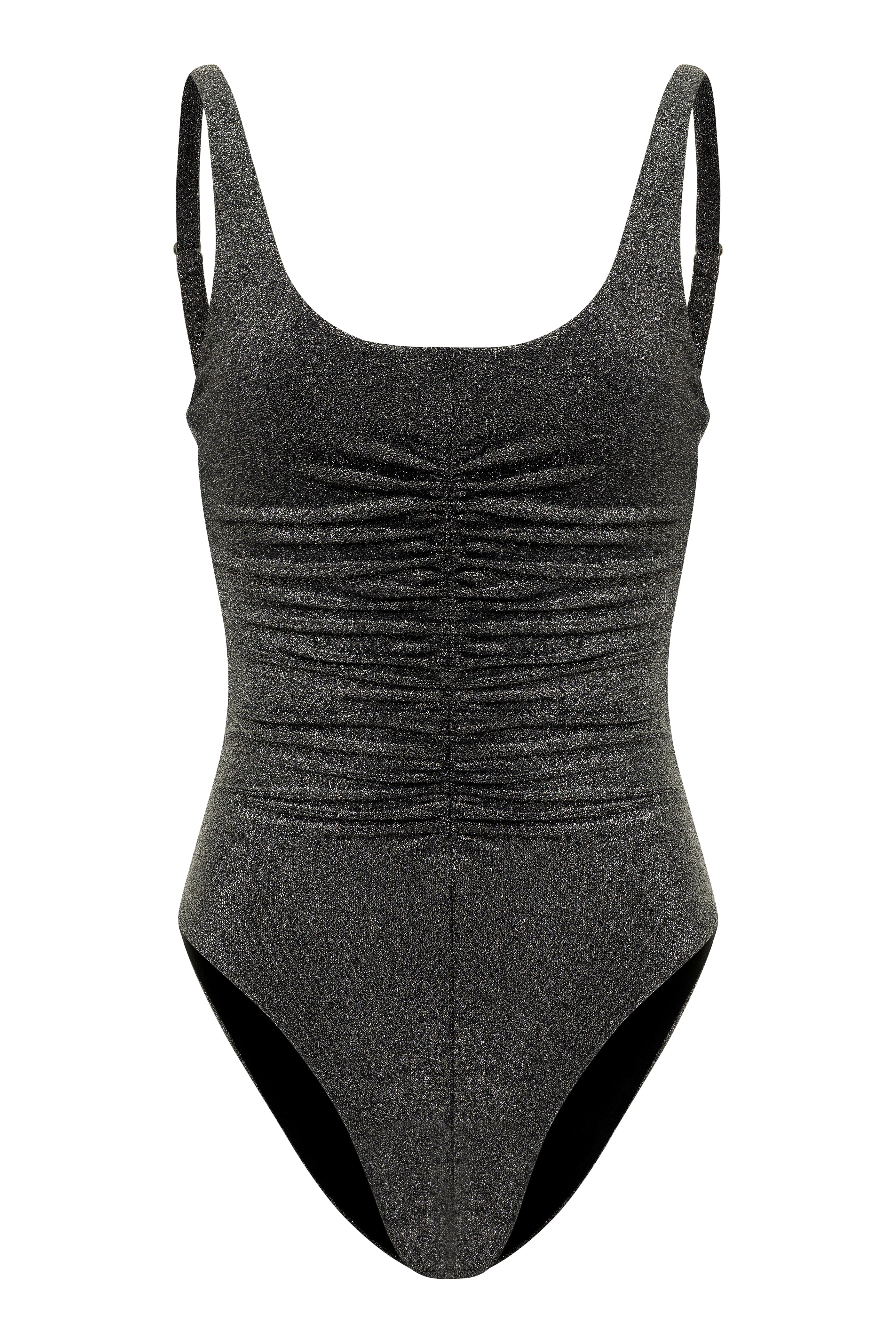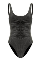 Introducing the Shea Swimsuit, perfectly suited for your everyday beach needs. This ruched sparkly one piece features a flattering look with full bottom coverage and adjustable straps, elevating your swim style allowing you to feel and look your best. It is crafted from high-end Italian lurex fabric, and lined with lycra for added comfort, making it the perfect addition to your vacation wardrobe.