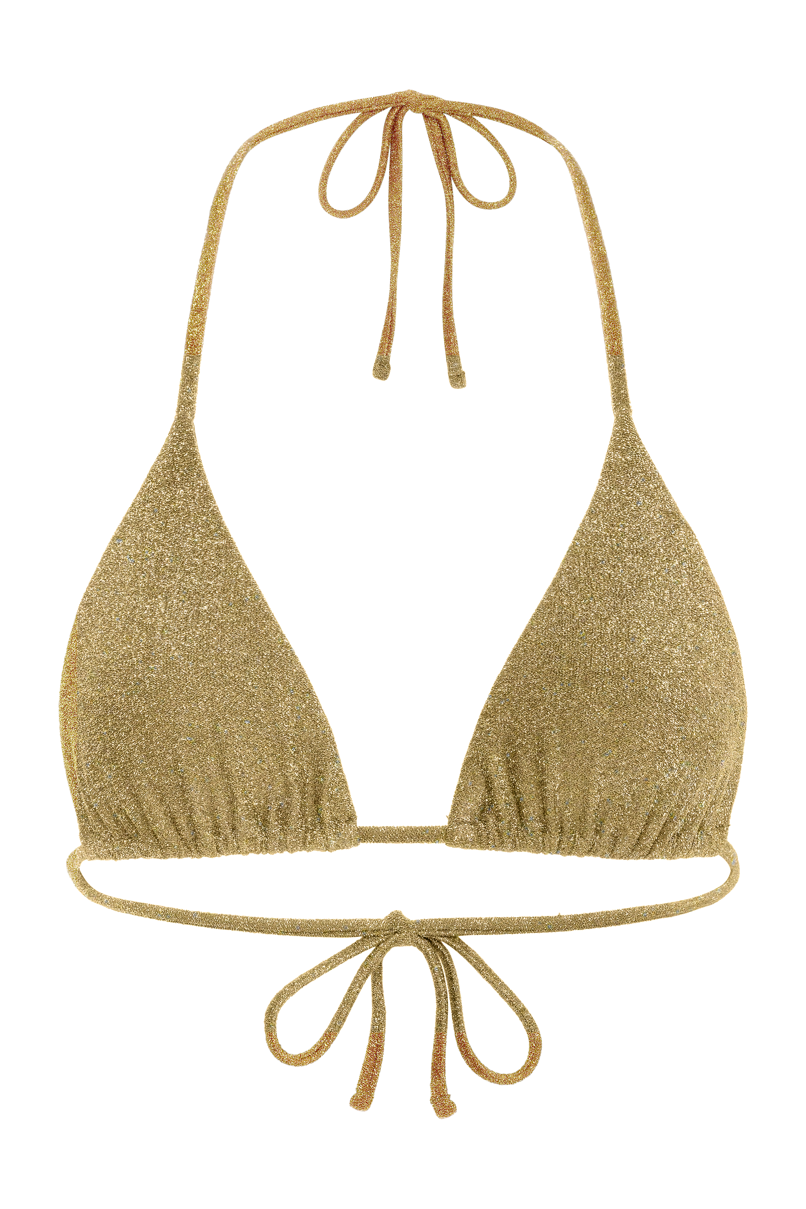 Introducing the sparkly triangle top of your dreams: The Becca Bikini Top. This top offers an adjustable tie around the neck and back for optimal support. It is crafted from high-end Italian lurex fabric, and lined with lycra for added comfort, making it the perfect addition to your vacation wardrobe.